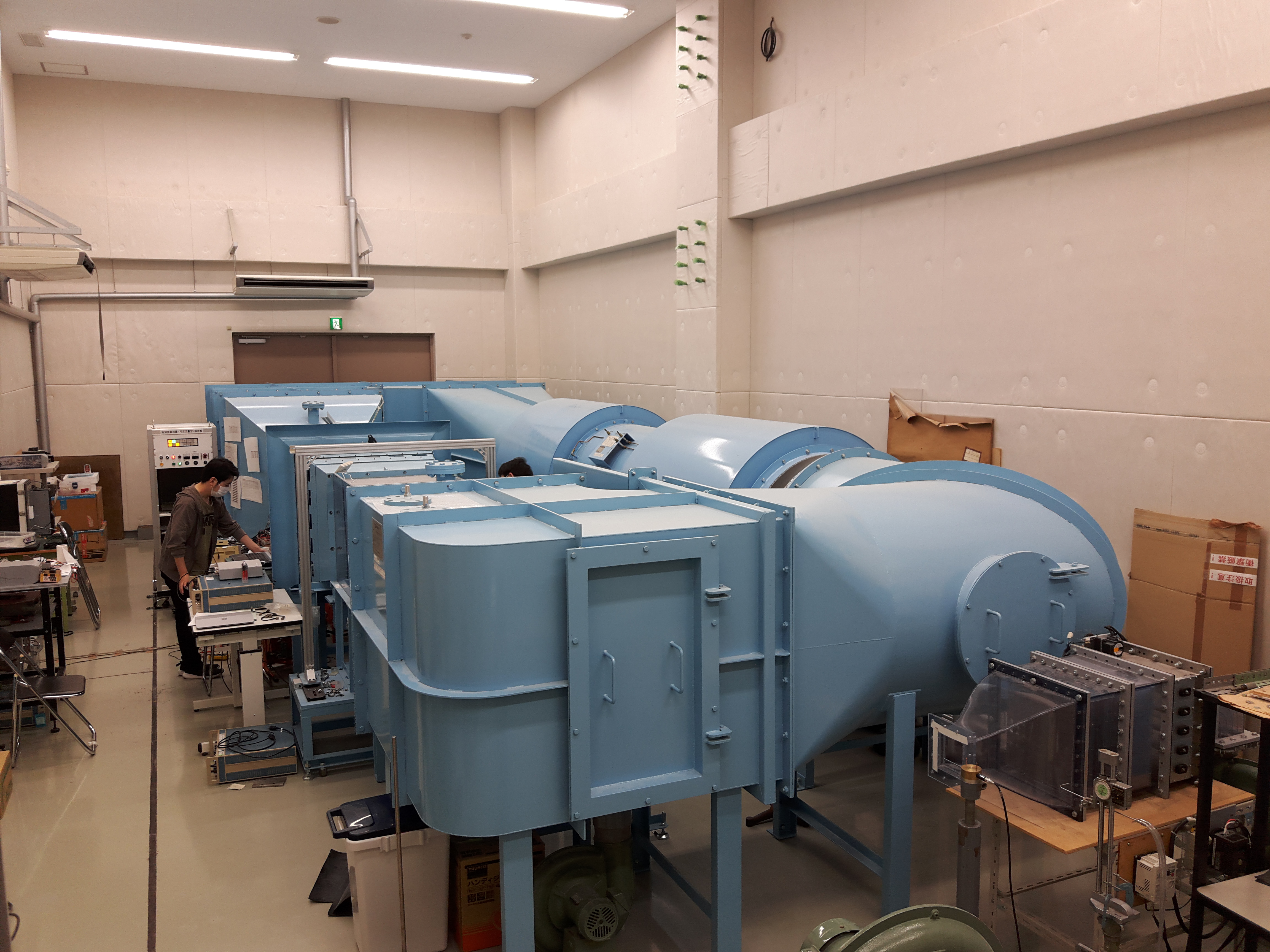 風洞は密閉回流型で,測定部の断面は 一辺 0.59 m の正方形,そして流れ方向の長さは 1.38 m です.